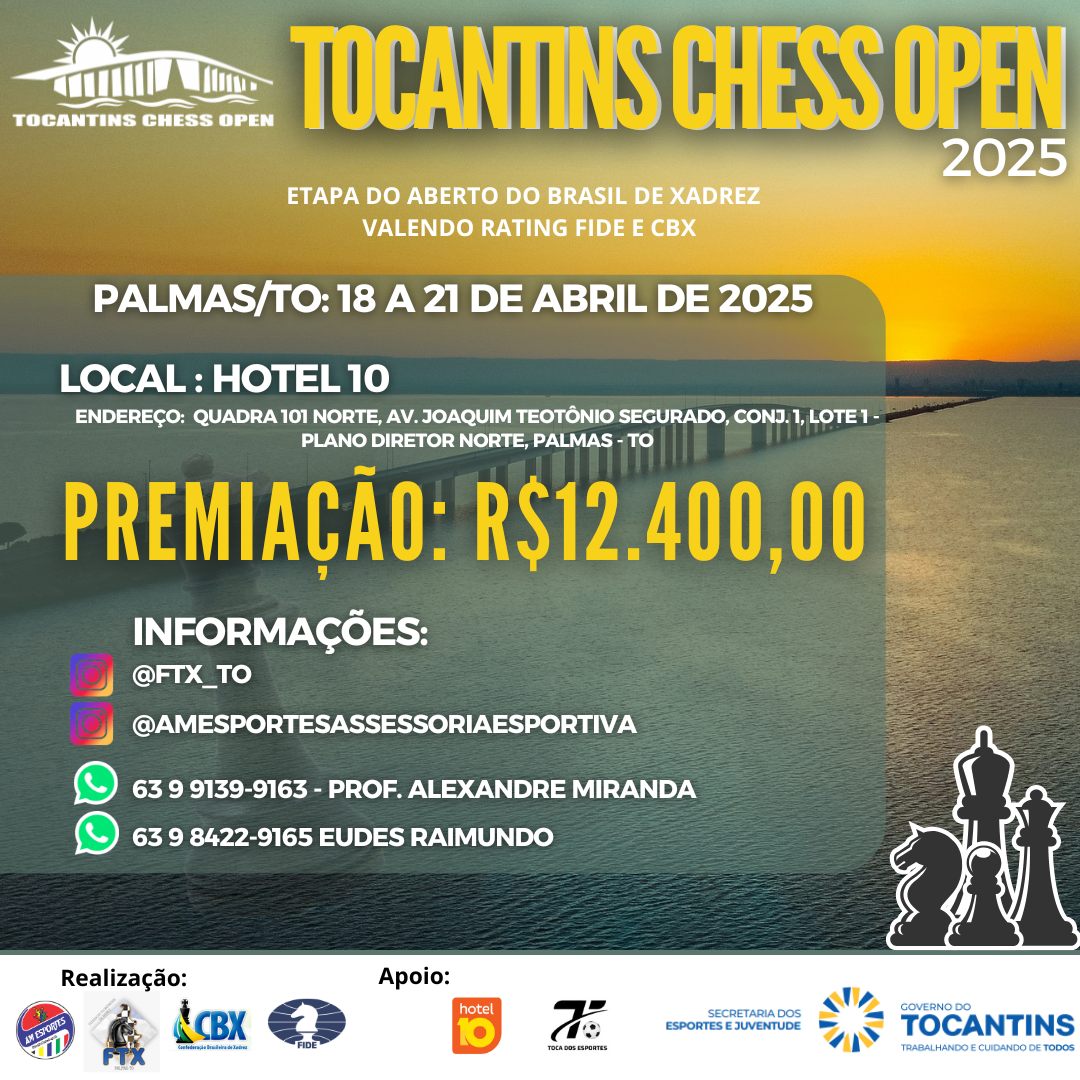 É com imensa alegria que anunciamos a oficialização de mais um grandioso evento de xadrez no estado do Tocantins, na cidade de Palmas: o TOCANTINS CHESS OPEN com dois eventos na sua grade. Nos dias 18 a 21 de abril o evento principal com R$12.400,00 em premiação e no dia 19 de abril sábado o evento Blitz com R$1.000,00 em premiação.